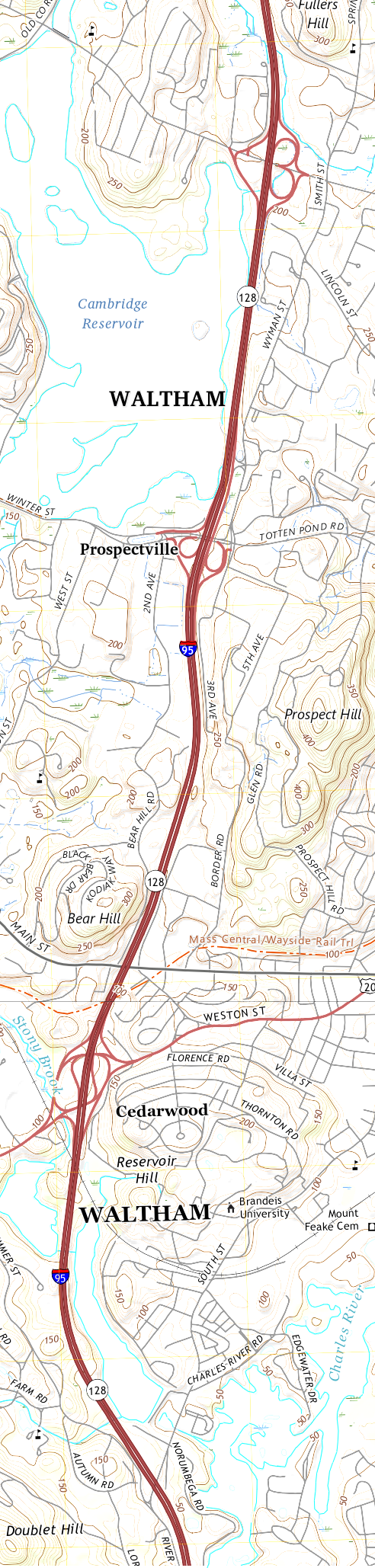 ![]() | The highway now known as Interstate 95 has had several names through the years.Originally designated in 1927 along a series of surface streets, Route 128 provided a circumferential route around the city of Boston.First open to traffic in 1951, it has been known as the Yankee Division Highway,and locals still refer to it as Route 128.In the 90's it was promoted by the state as "America's TechnologyHighway", for the high-tech electronics and computer companies in the area.Now 4 lanes north and south through west Waltham, it has 3 exits. Exit 26 connects toWeston Street (Rt. 20), the fastest route toMain Street. Exit 27 goes west toWinter Street and east toTotten Pond Road. The northernmost exit 28connects to Trapelo Road.