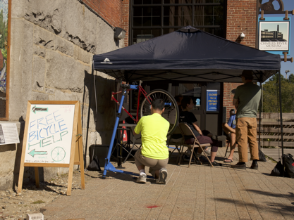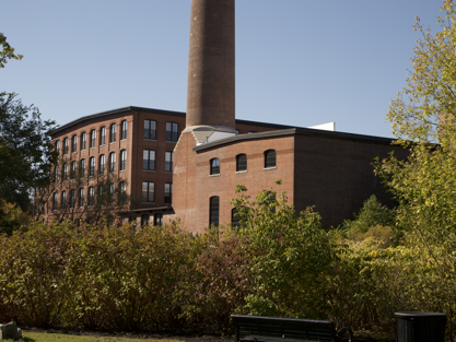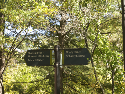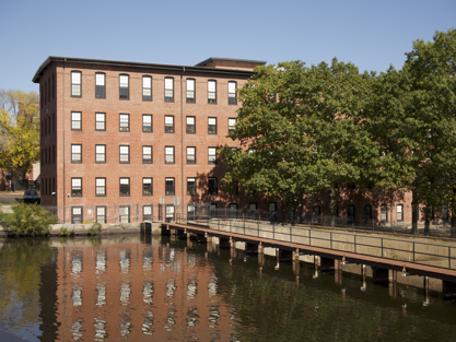 You can make a loop over the Moody Street bridge, behind the mill buildings, and over the Elm Street bridge, and back again along the south side of the river (green line on map), and along the Blue Heron Trail (blue line).