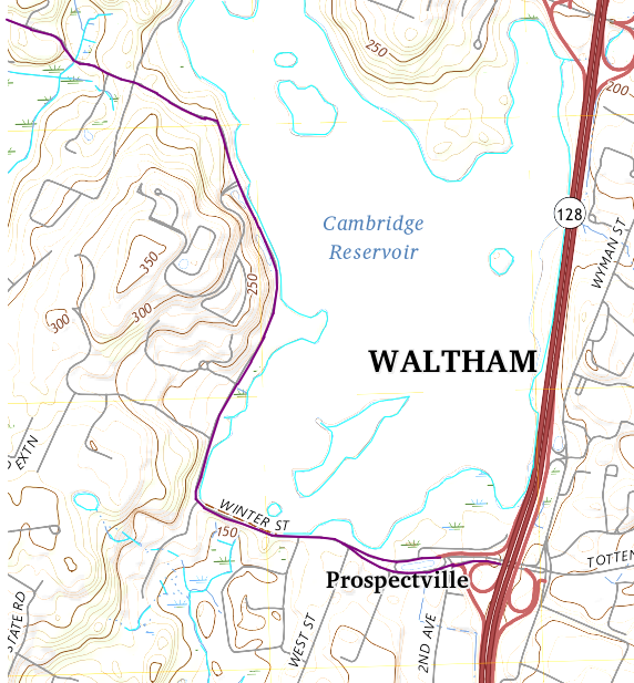 Winter Streetbegins at the bridge where Totten Pond Road crosses overRt. 128. It follows the west side of the reservoir and continues into Lincoln(see map)