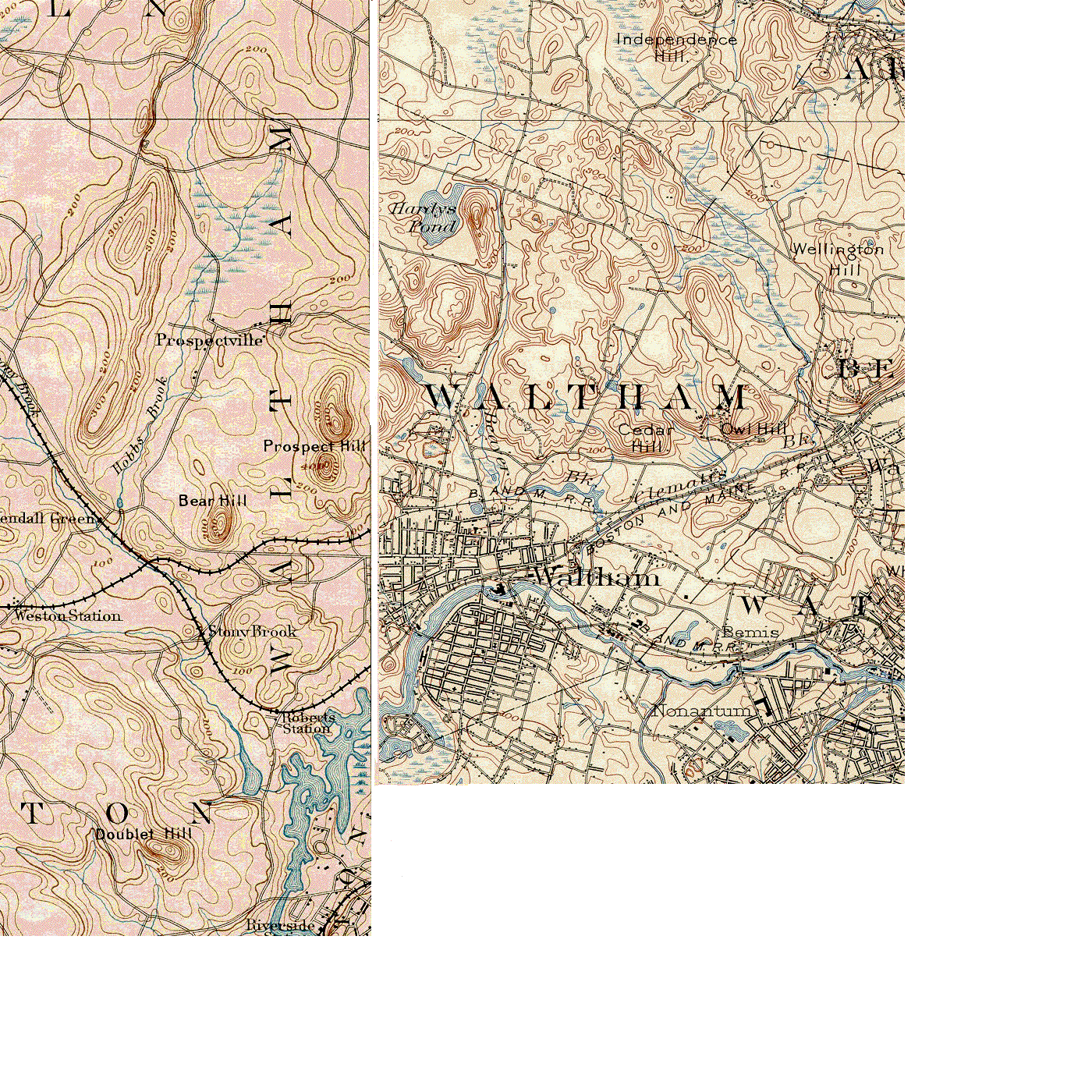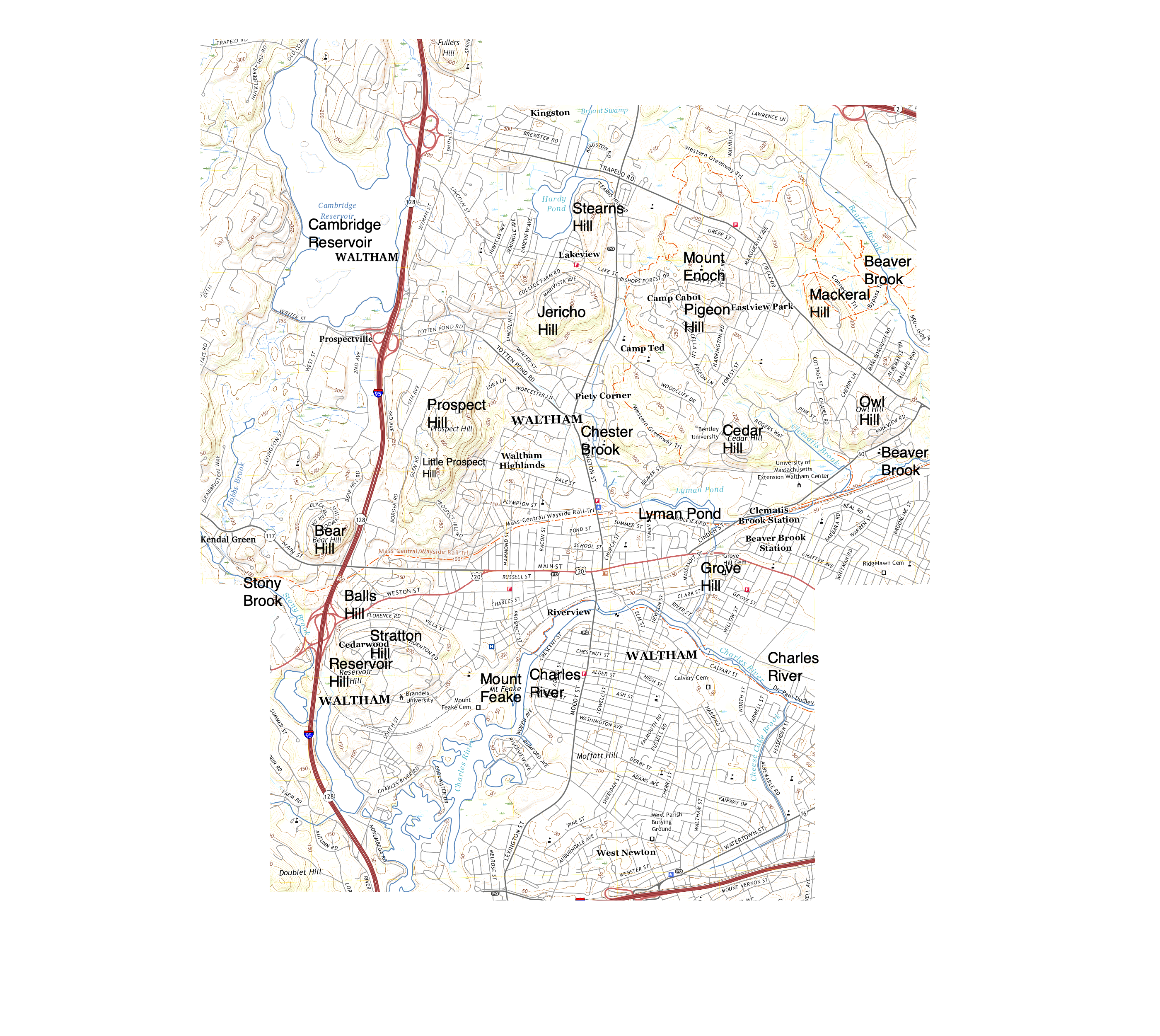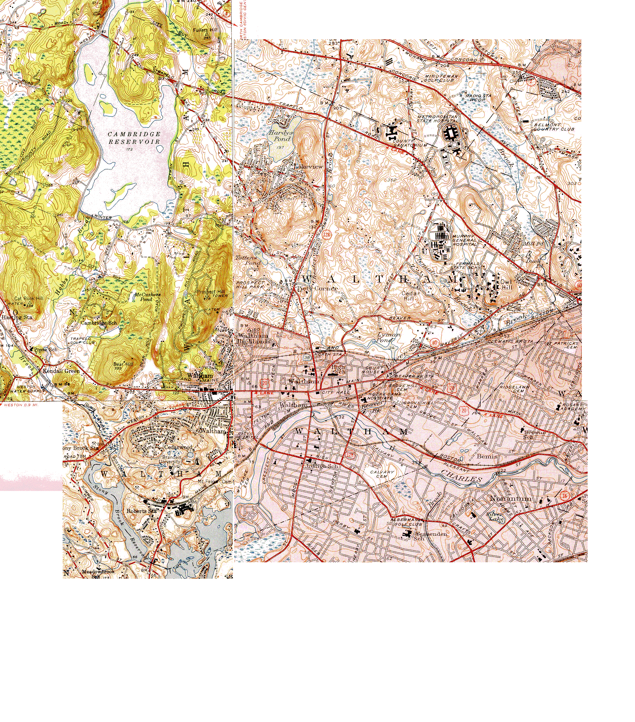 In the U. S. Geographical Survey (USGS) 15' map series, Waltham is covered by the NorthEast (NE) quarter of the Framingham map, and the NW quarter of the Boston map. The 4 maps which cover Waltham in the 7.5' series are the SE quarter of the Concord quadrangle, SW of Lexington, NE of Natick, and NW of Newton.