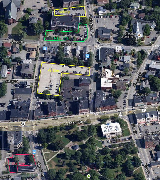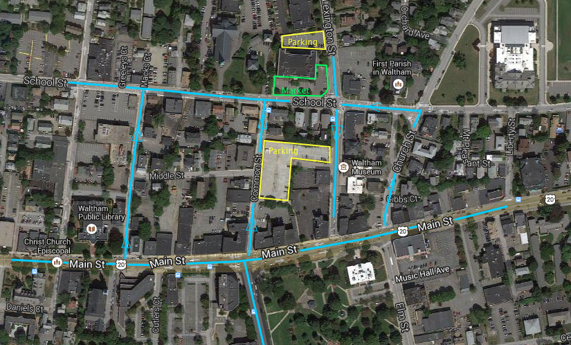 From the south on Moody Street: From the middle lane, cross over Main Street onto Common Street. Turn right onto School Street. Pass the Market site on the left, turn right onto Lexington Street, and then right into Common Square Parking Deck.